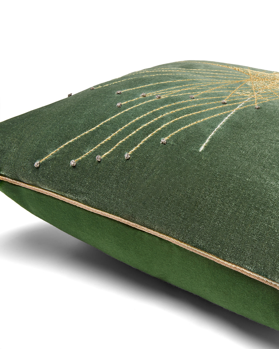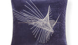 Our Construct cushion is inspired by their screw mobile structures, which featured long metal rods that created sweeping fans of light. With our cushion, these geometric forms are hand-rendered using a mixture of metallic embroidery threads on a background of ivory, green, navy or bronze velvet.