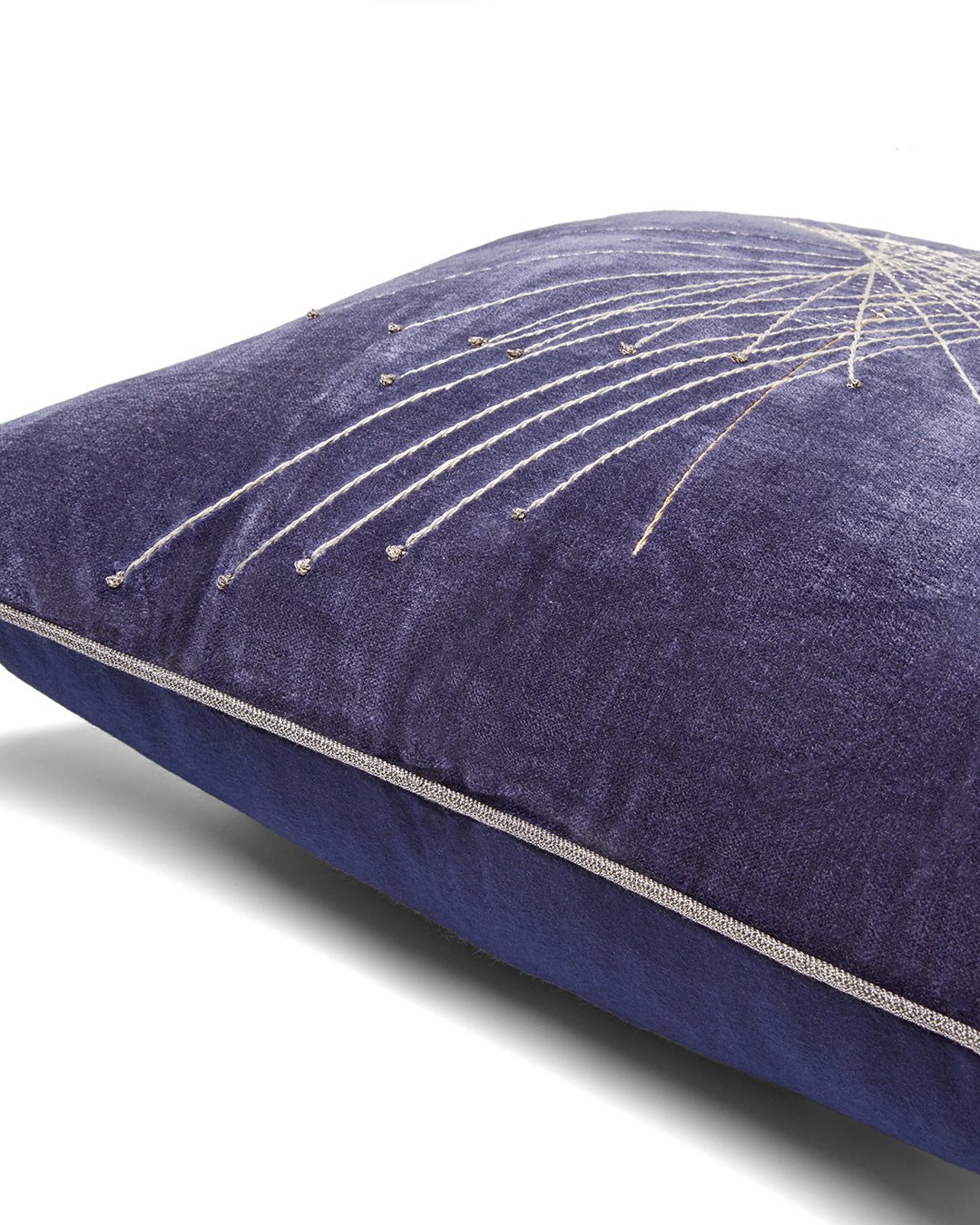 Our Construct cushion is inspired by their screw mobile structures, which featured long metal rods that created sweeping fans of light. With our cushion, these geometric forms are hand-rendered using a mixture of metallic embroidery threads on a background of ivory, green, navy or bronze velvet.