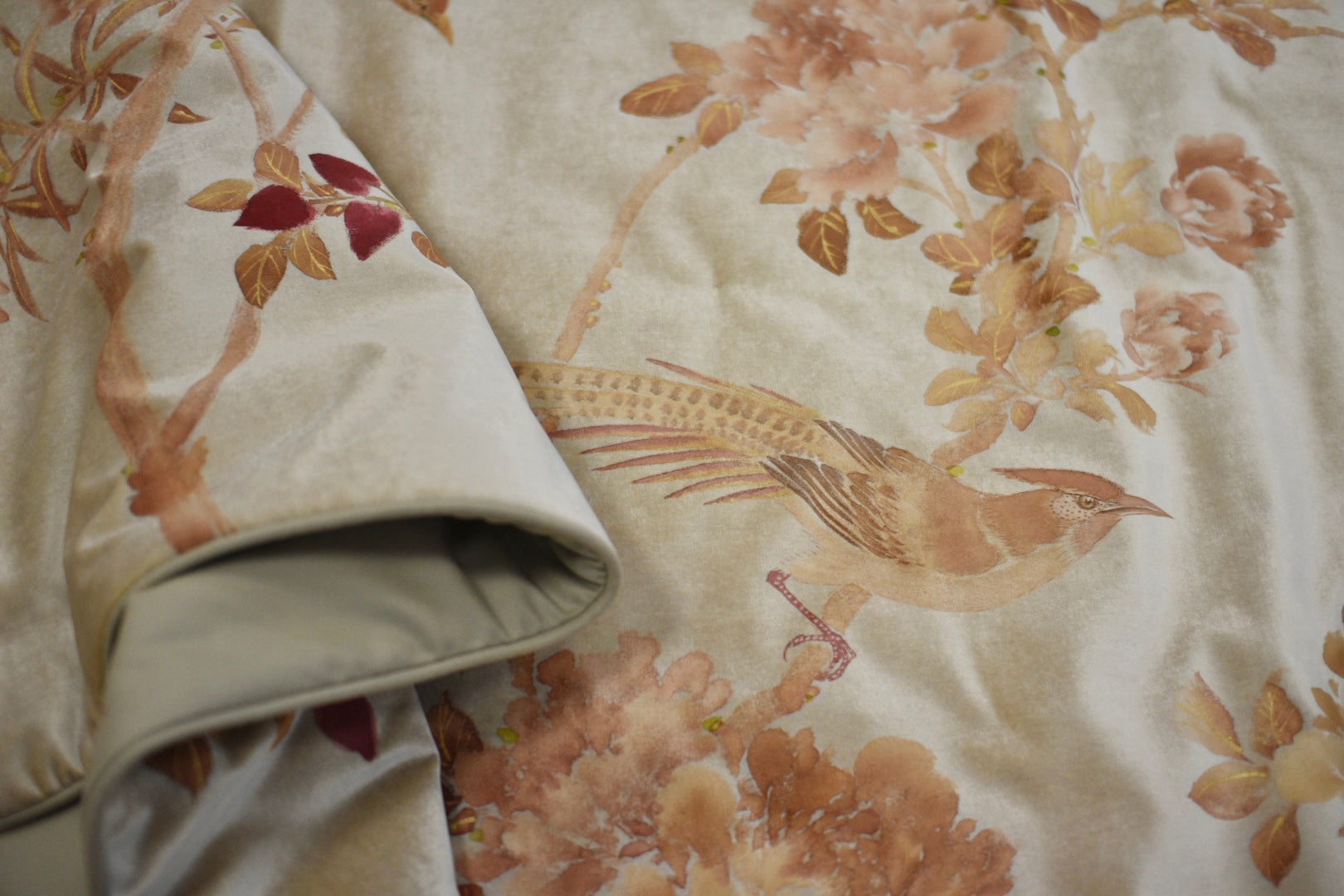 Chic and monochromatic, Terra Rose celebrates rust and terracotta hues and features details exquisitely rendered in metallic bronze thread.