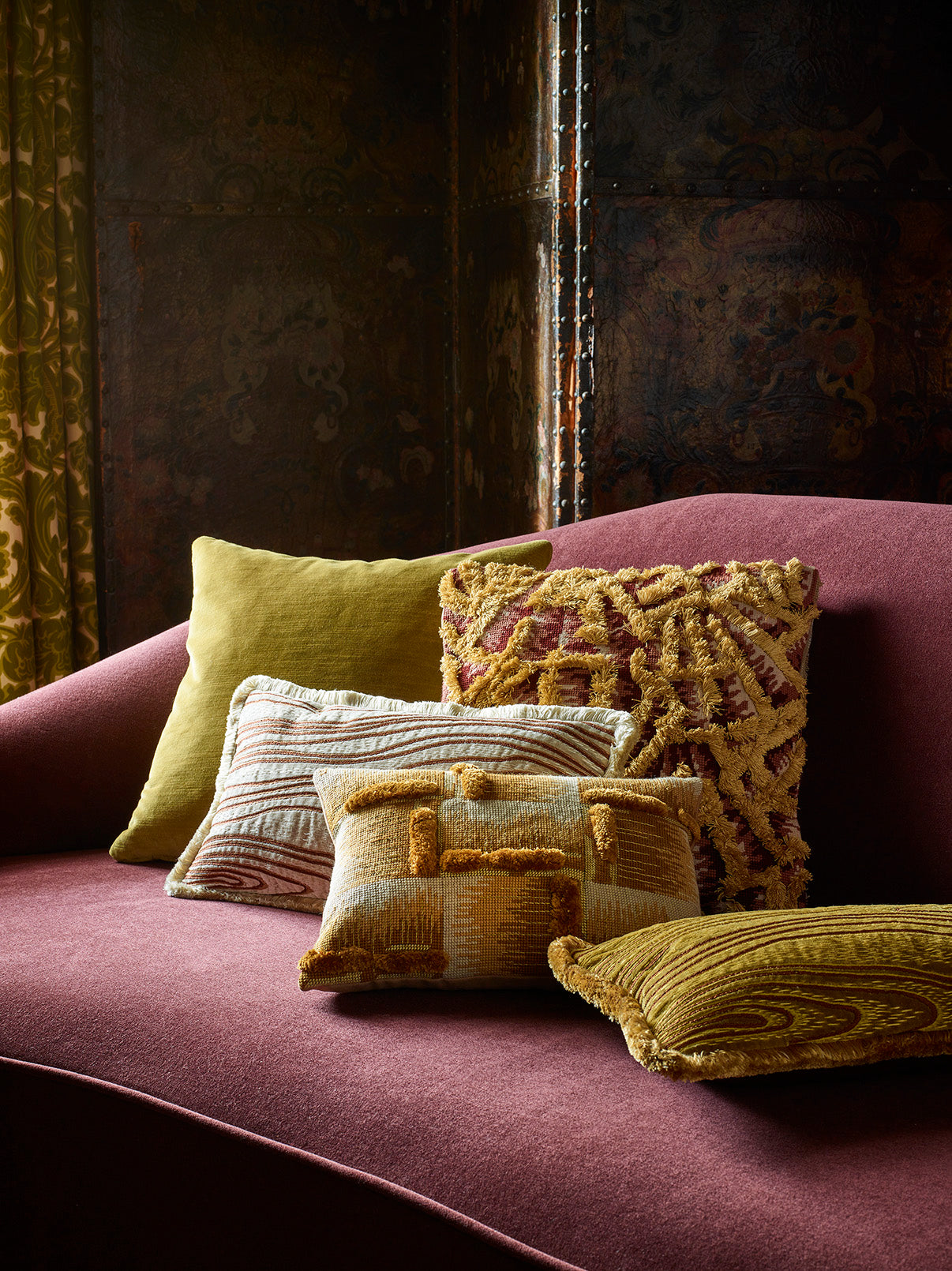 What could easily have been a very gauche result was in the end so beautiful it became the inspiration first for an opulent fabric made with Italian velvet and silk, and now this cushion, where the design is depicted using a silk velvet with cotton over-embroidery.