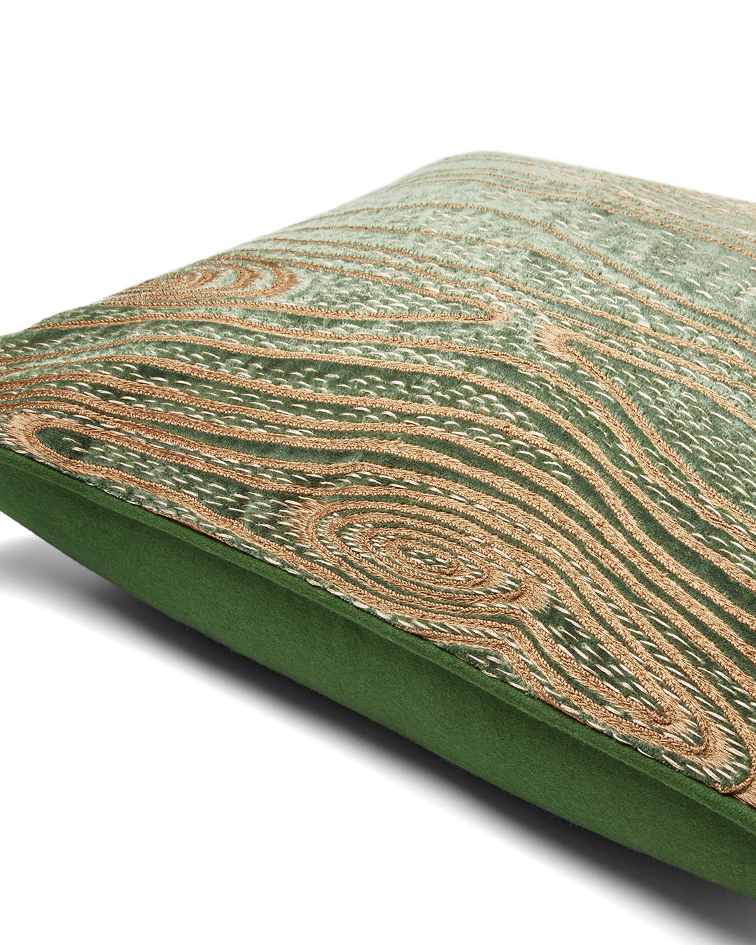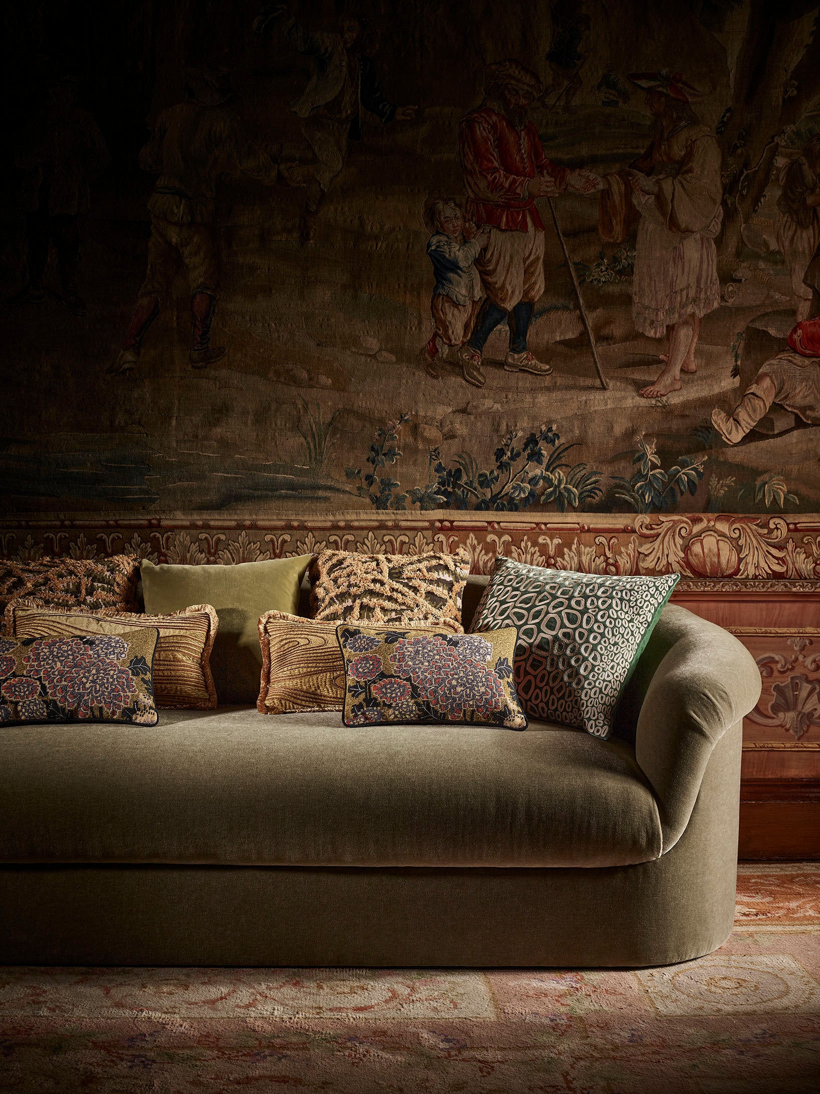 What could easily have been a very gauche result was in the end so beautiful it became the inspiration first for an opulent fabric made with Italian velvet and silk, and now this cushion, where the design is depicted using a silk velvet with cotton over-embroidery.